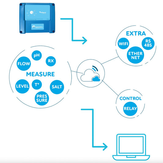 Wifipool CONNECT-PRO meet- en controledoos uitbreidbaar met pH, RX, 3 x temperatuur-, flow-, 3 x niveau-, druk- en conductiviteitsmeting, ethernetaansluiting en 4 stekkers