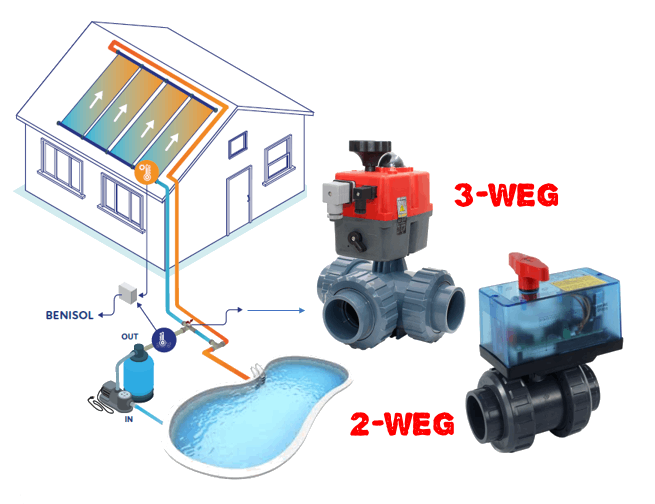 De automatische regelklep regelt de stroomrichting in de verwarmingscyclus van uw zwembad. De automatische zonneregeling is verkrijgbaar in 3-weg en 2-weg kleppen van 50 en 63 mm. De gemotoriseerde kleppen worden verkocht met alleen de motor, of plug and play met de geïntegreerde Benisol temperatuurregelaar.