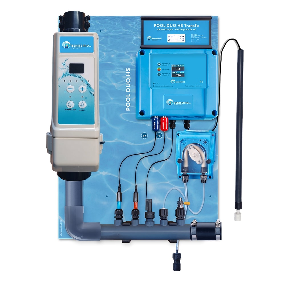 Zowel de Beni Duo als de Beni Duo Wifi zijn volledig voorgemonteerd op een plaat. Alle verbindingen en leidingen zijn reeds gemaakt, zodat u zelf niets meer in mekaar hoeft te steken. Plaats het paneel gewoon op de retourleiding naar het zwembad in een leiding van 50mm. Dit kan via de bijgeleverde 50mm rubber moffen. Een bypass is niet verplicht.