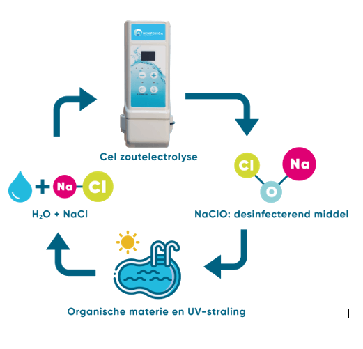 Om het chloorgehalte aan te passen zal de zoutelectrolyse automatisch chloor (of bleekmiddel) aanmaken via een zoutelectrolysecel. Voor een zwembad van 50 m³ heeft u een zoutelektrolysetoestel nodig dat minstens 15 g chloor per uur aanmaakt. Om een zoutelektrolyse te laten werken, is het nodig vooraf zout aan het zwembad toe te voegen. Dit zout wordt dan door de elektrolysecel omgezet naar chloor. Na reactie van het chloor met algen, bacteriën ... wordt het chloor terug omgezet naar zout. Er moet tevens een aarding aangesloten worden en is het noodzakelijk te kiezen tussen apparatuur "zoutarm " of "zoutrijk " met respectievelijk 2 of 4 g/liter zout (NaCl) opgelost in het zwembadwater (100 of 200 kg per voor een zwembad van 50 m³). De werking van “laag” en “hoog” zout is identiek, alleen het gevoel van het water verandert.