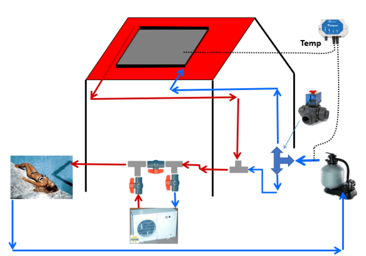 Bij een gecombineerde warmtepomp- en zonnecollectorinstallatie wordt het water eerst door de zonnecollector geleid. De warmtepomp is ingesteld op 2-4°C lager dan normaal (setpoint 24-26°C). De verlaging van de energiekosten betaalt uw zonne-installatie in 2-3 jaar terug.