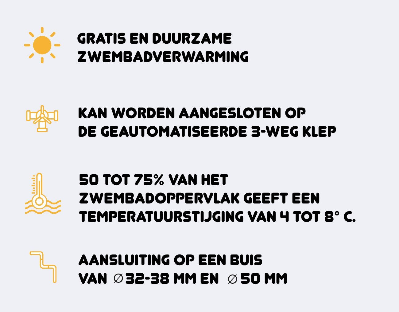 Zonneverwarming is toepasbaar in alle zwembaden, groot en klein, heeft de beste prijs/warmteverhouding en is de meest ecologische manier om een zwembad te verwarmen.