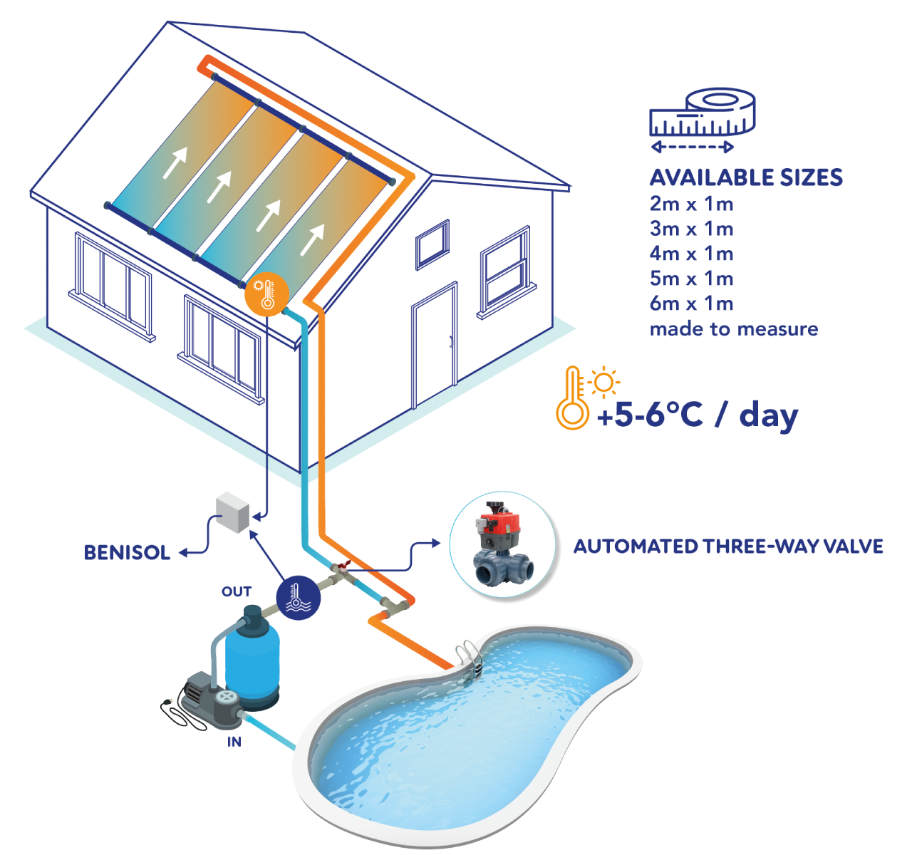 De automatische klep leidt -dankzij het Benisol sturingskastje-  het water naar de zonnecollectoren zodra de temperatuur bovenop de verwarming hoger is dan de watertemperatuur. Bij een temperatuur van 32 °C (instelbaar) stuurt de klep het water rechtstreeks naar het zwembad en stopt dus het verwarmen.