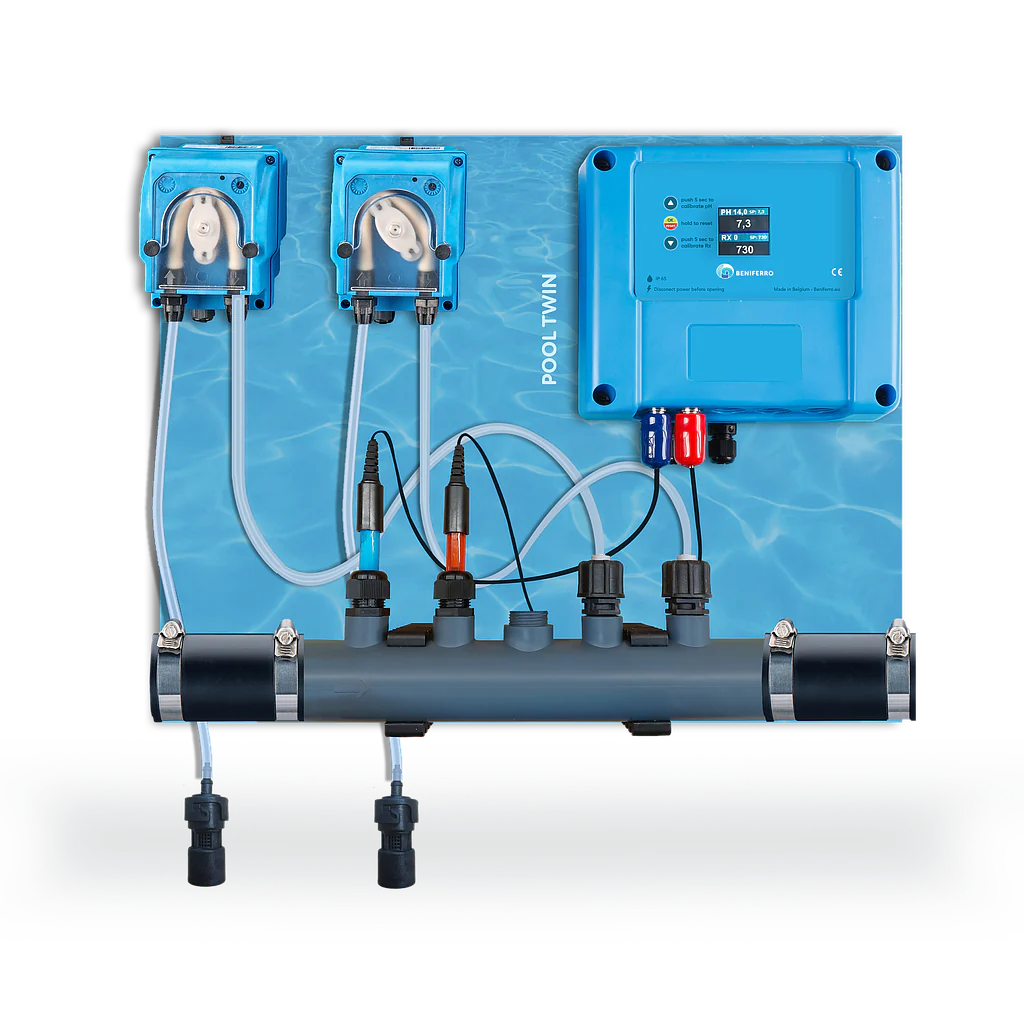 Zowel  de Beni Twin als de Beni Twin Wifi  zijn volledig voorgemonteerd op een plaat. Alle verbindingen en leidingen zijn reeds gemaakt, zodat u zelf niets meer in elkaar hoeft te steken. Plaats het paneel gewoon op de retourleiding naar het zwembad in een leiding van 50 mm. Dit kan zonder te plakken, via de bijgeleverde 50mm rubber moffen. Een bypass is niet verplicht.